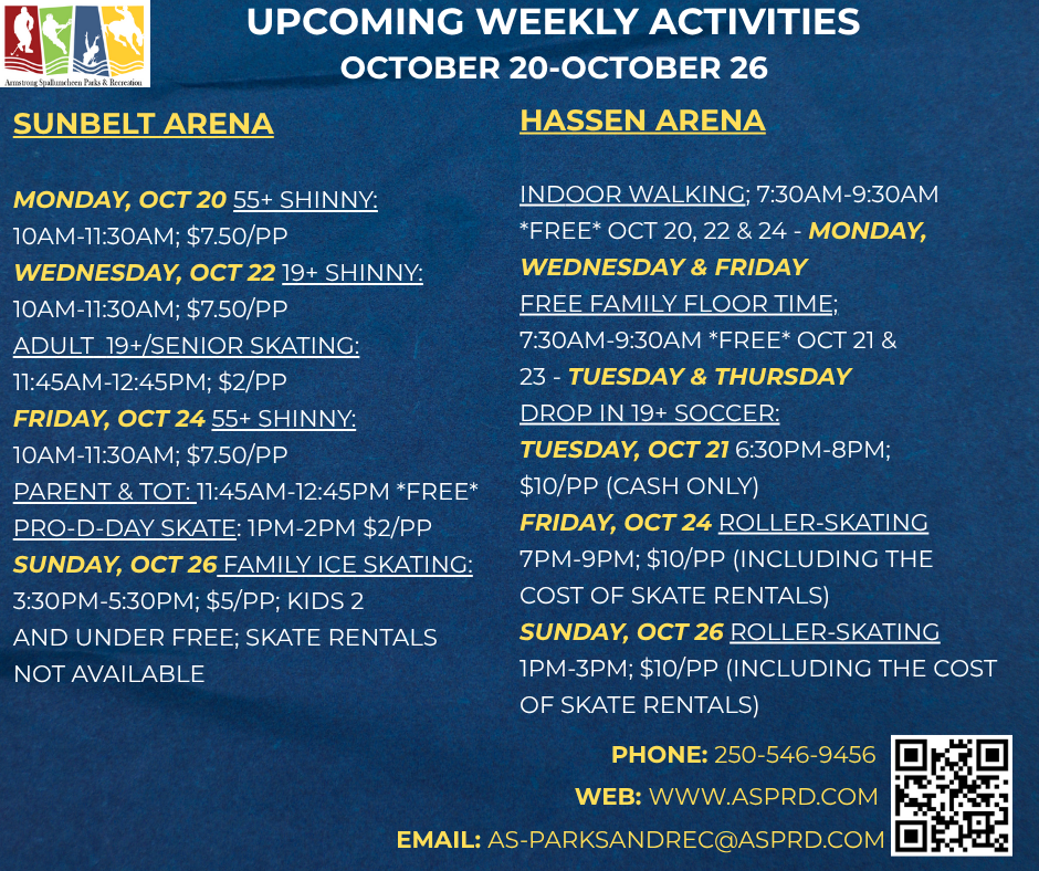 Upcoming Weekly Activities October 20 – 26 By Armstrong Spallumcheen Parks & Recreation Commission|2025-10-23T22:41:32+00:00October 23, 2025|News|Comments Off on Upcoming Weekly Activities October 20 – 26 Share This Story, Choose Your Platform! FacebookXRedditLinkedInWhatsAppTelegramTumblrPinterestVkXingEmail About the Author: Armstrong Spallumcheen Parks & Recreation Commission Related Posts Upcoming Weekly Activities October 27 – November 2 Upcoming Weekly Activities October 27 – November 2 October 23, 2025 Roller-Skating Season starting! Roller-Skating Season starting! October 2, 2025 Weekly Activities Sept 29 – Oct 5 Weekly Activities Sept 29 – Oct 5 October 2, 2025