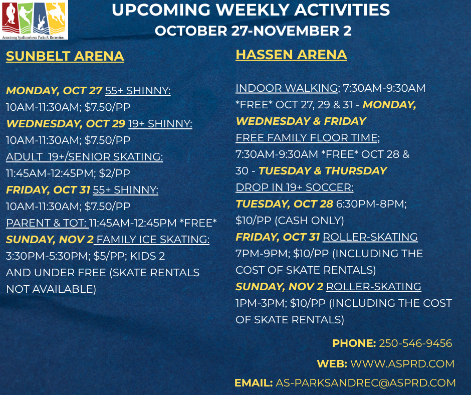 Upcoming Weekly Activities October 27 – November 2 By Armstrong Spallumcheen Parks & Recreation Commission|2025-10-23T22:40:21+00:00October 23, 2025|News|Comments Off on Upcoming Weekly Activities October 27 – November 2 Share This Story, Choose Your Platform! FacebookXRedditLinkedInWhatsAppTelegramTumblrPinterestVkXingEmail About the Author: Armstrong Spallumcheen Parks & Recreation Commission Related Posts Upcoming Weekly Activities October 20 – 26 Upcoming Weekly Activities October 20 – 26 October 23, 2025 Roller-Skating Season starting! Roller-Skating Season starting! October 2, 2025 Weekly Activities Sept 29 – Oct 5 Weekly Activities Sept 29 – Oct 5 October 2, 2025
