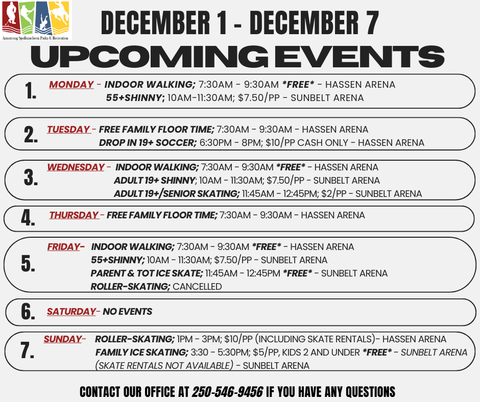 By Armstrong Spallumcheen Parks & Recreation Commission|2025-11-28T20:39:02+00:00November 28, 2025|News|Comments Off on Weekly Activities December 1 – December 7