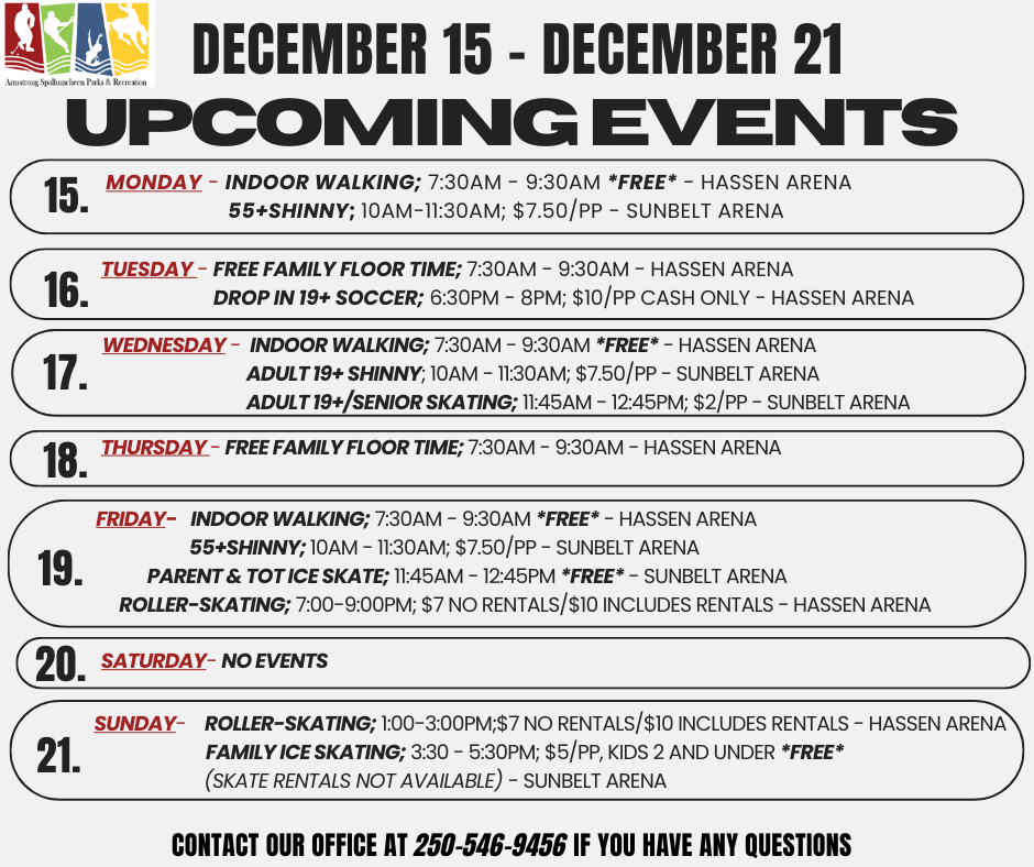 Weekly Activities December 15 – December 21 By Armstrong Spallumcheen Parks & Recreation Commission|2025-12-12T21:10:05+00:00December 12, 2025|News|Comments Off on Weekly Activities December 15 – December 21 Share This Story, Choose Your Platform! FacebookXRedditLinkedInWhatsAppTelegramTumblrPinterestVkXingEmail About the Author: Armstrong Spallumcheen Parks & Recreation Commission Related Posts Weekly Activities January 19 – January 25 Weekly Activities January 19 – January 25 January 16, 2026 Weekly Activities January 12 – January 18 Weekly Activities January 12 – January 18 January 9, 2026 Weekly Activities January 5 – January 11 Weekly Activities January 5 – January 11 January 2, 2026 Free Holiday Skating Free Holiday Skating December 19, 2025