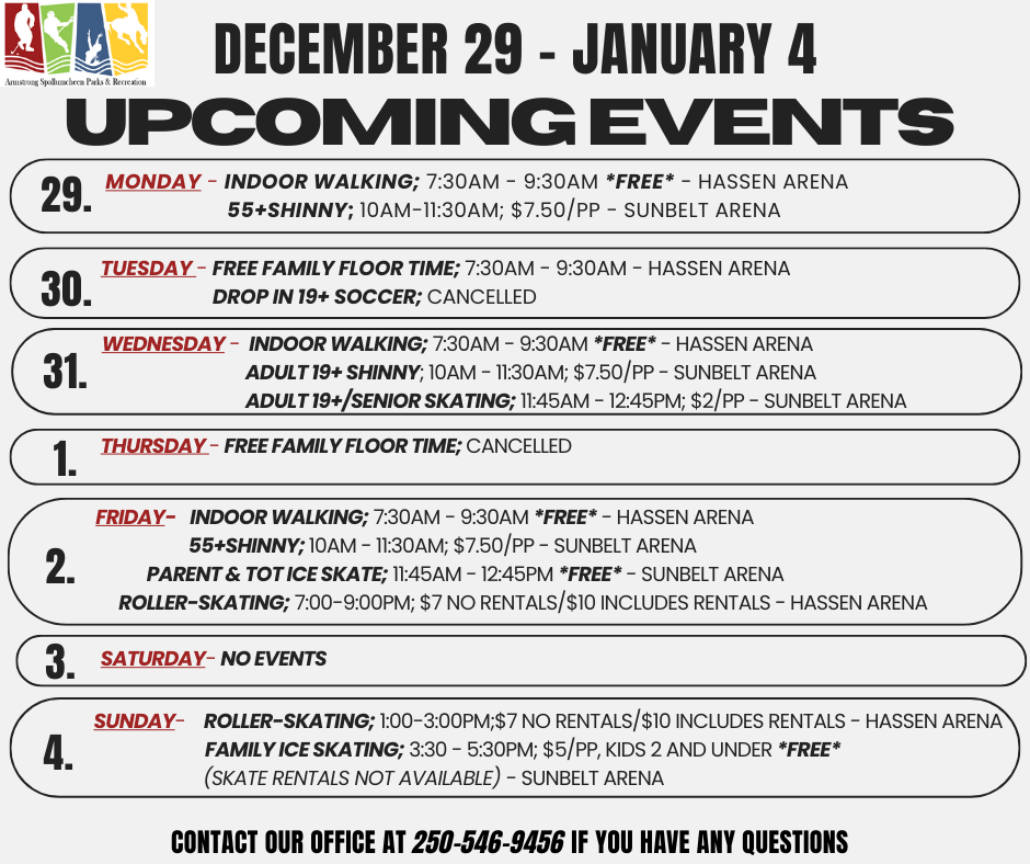 By Armstrong Spallumcheen Parks & Recreation Commission|2025-12-19T22:44:19+00:00December 19, 2025|News|Comments Off on Weekly Activities December 29 – January 4