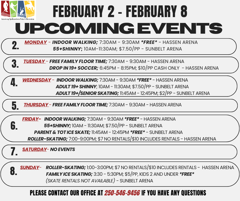 By Armstrong Spallumcheen Parks & Recreation Commission|2026-01-30T21:54:16+00:00January 30, 2026|News|Comments Off on Weekly Activities February 2 – February 8