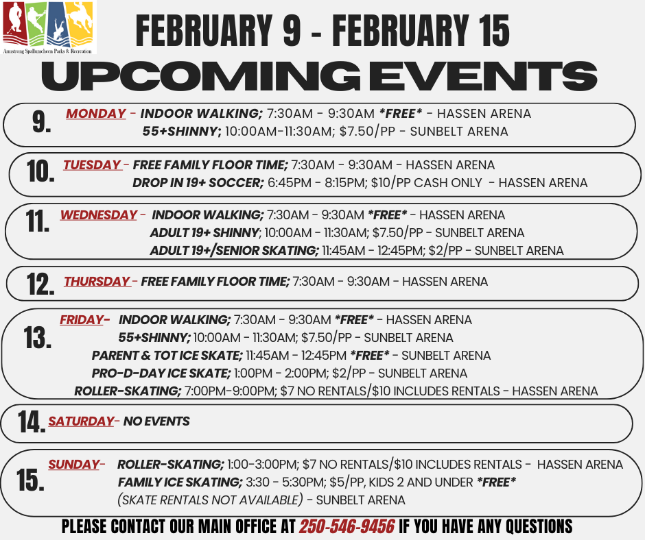 Upcoming Weekly Activities February 9 – February 15 By Armstrong Spallumcheen Parks & Recreation Commission|2026-02-06T22:02:43+00:00February 6, 2026|News|Comments Off on Upcoming Weekly Activities February 9 – February 15 Share This Story, Choose Your Platform! FacebookXRedditLinkedInWhatsAppTelegramTumblrPinterestVkXingEmail About the Author: Armstrong Spallumcheen Parks & Recreation Commission Related Posts Upcoming Pro-D-Day & Stat Holiday Skates Upcoming Pro-D-Day & Stat Holiday Skates February 2, 2026 Family Day – Upcoming Main Office Closure Family Day – Upcoming Main Office Closure February 2, 2026 Weekly Activities February 2 – February 8 Weekly Activities February 2 – February 8 January 30, 2026 Weekly Activities January 26 – February 1 Weekly Activities January 26 – February 1 January 23, 2026