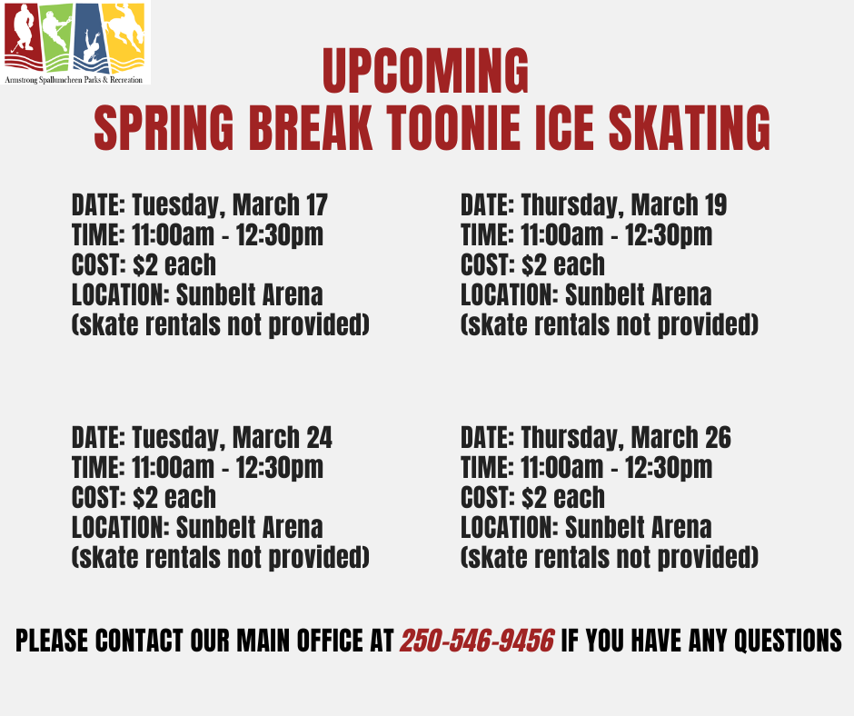 Public Programming March 16 – March 22 By Armstrong Spallumcheen Parks & Recreation Commission|2026-03-10T19:20:57+00:00March 10, 2026|News|Comments Off on Public Programming March 16 – March 22 Share This Story, Choose Your Platform! FacebookXRedditLinkedInWhatsAppTelegramTumblrPinterestVkXingEmail About the Author: Armstrong Spallumcheen Parks & Recreation Commission Related Posts Public Programming March 23 – March 29 Public Programming March 23 – March 29 March 10, 2026 Public Programming March 9 – March 15 Public Programming March 9 – March 15 March 6, 2026 Upcoming Spring Break Toonie Ice Skating Upcoming Spring Break Toonie Ice Skating February 26, 2026 Weekly Activities March 2 – March 8 Weekly Activities March 2 – March 8 February 26, 2026