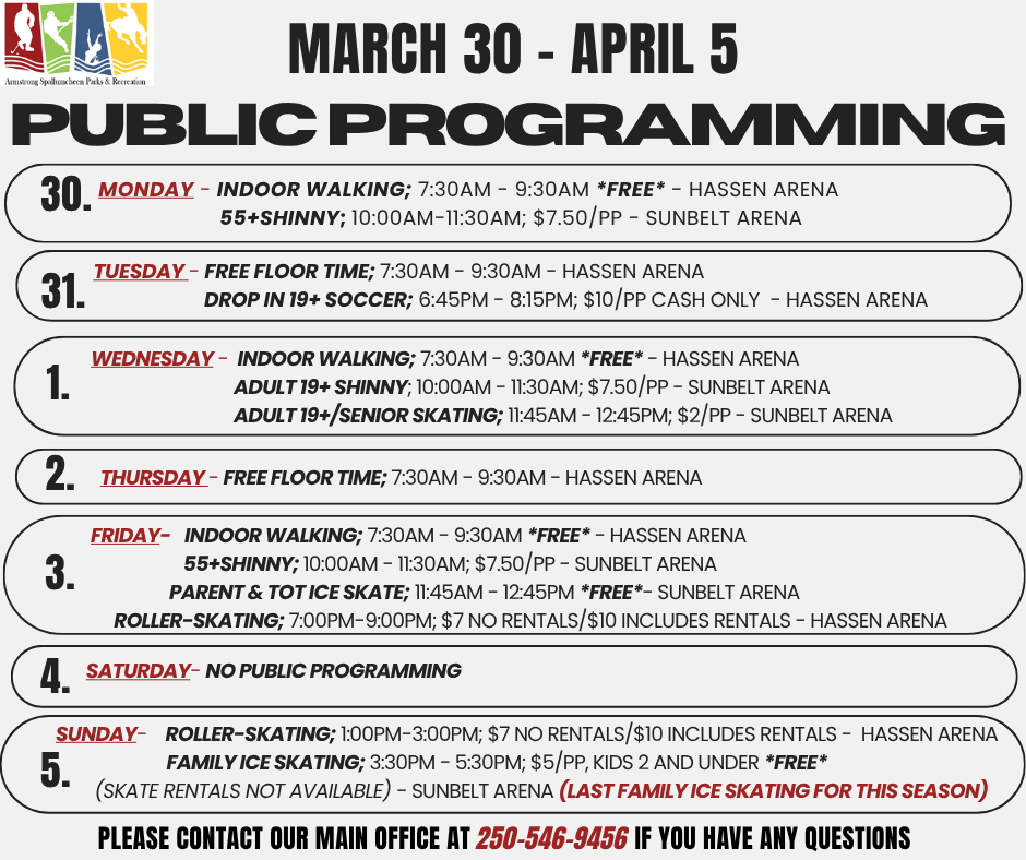 Public Programming March 30 – April 5 By Armstrong Spallumcheen Parks & Recreation Commission|2026-03-26T19:58:29+00:00March 26, 2026|News|Comments Off on Public Programming March 30 – April 5 Share This Story, Choose Your Platform! FacebookXRedditLinkedInWhatsAppTelegramTumblrPinterestVkXingEmail About the Author: Armstrong Spallumcheen Parks & Recreation Commission Related Posts Public Programming March 23 – March 29 Public Programming March 23 – March 29 March 10, 2026 Public Programming March 16 – March 22 Public Programming March 16 – March 22 March 10, 2026 Public Programming March 9 – March 15 Public Programming March 9 – March 15 March 6, 2026 Upcoming Spring Break Toonie Ice Skating Upcoming Spring Break Toonie Ice Skating February 26, 2026